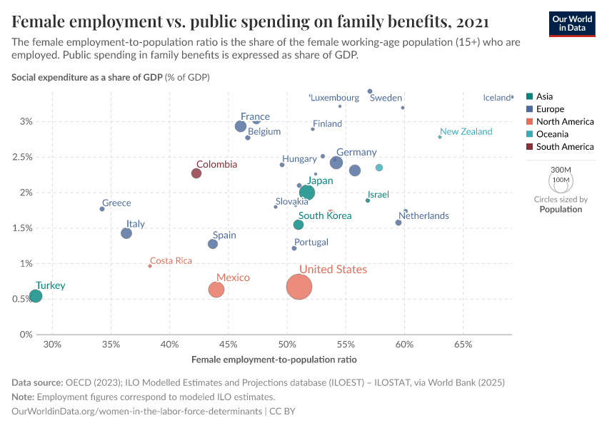 In the chart here, we show that female employment, measured as the employment-to-population ratios for women 15+, tends to be higher in countries with higher levels of public spending on family benefits (i.e. child-related cash transfers to families with children, public spending on services for families with children, and financial support for families provided through the tax system, including tax exemptions).