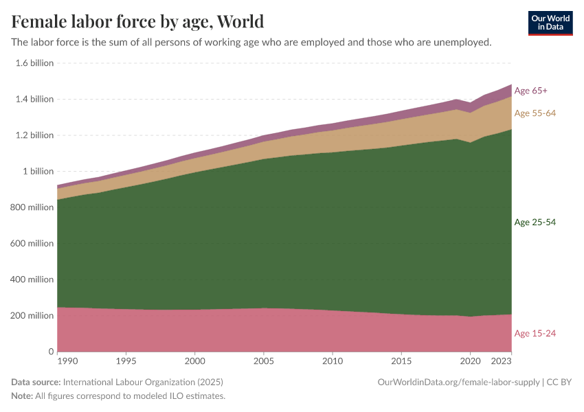 As we can see, today the number of women in the global labor force who are younger than 25 is slightly less than what it was in the year 2000. However, the global female labor force grew by almost 40% over the same period.