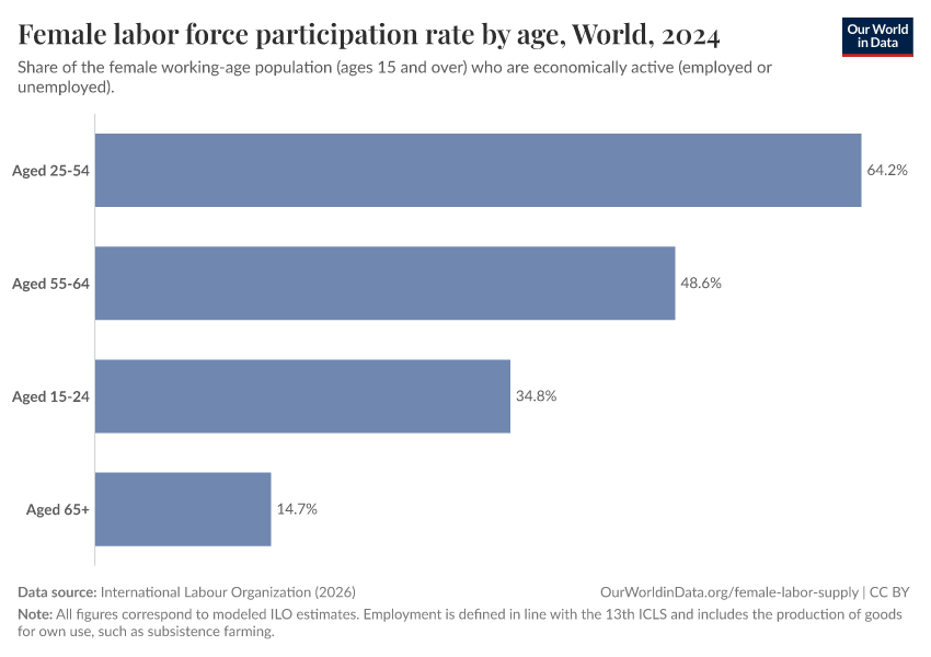 Participation varies with age. In most countries, it is highest among women in their prime working ages (25–54), and lower among younger and older women. However, the balance between younger and older women differs across countries. In some, younger women participate more; in others, older women do.