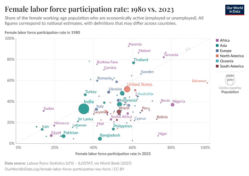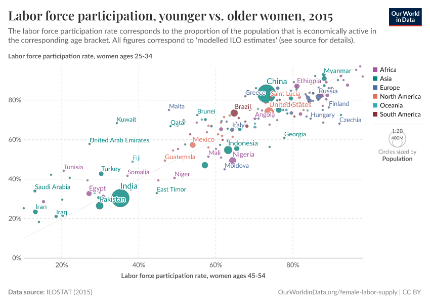 An important point to note is that the chart includes all women above 15 years of age. This means that the trends conflate changes across different population sub-groups (e.g. young women, married women, older women above retirement age, etc.). We discuss this in more detail below.