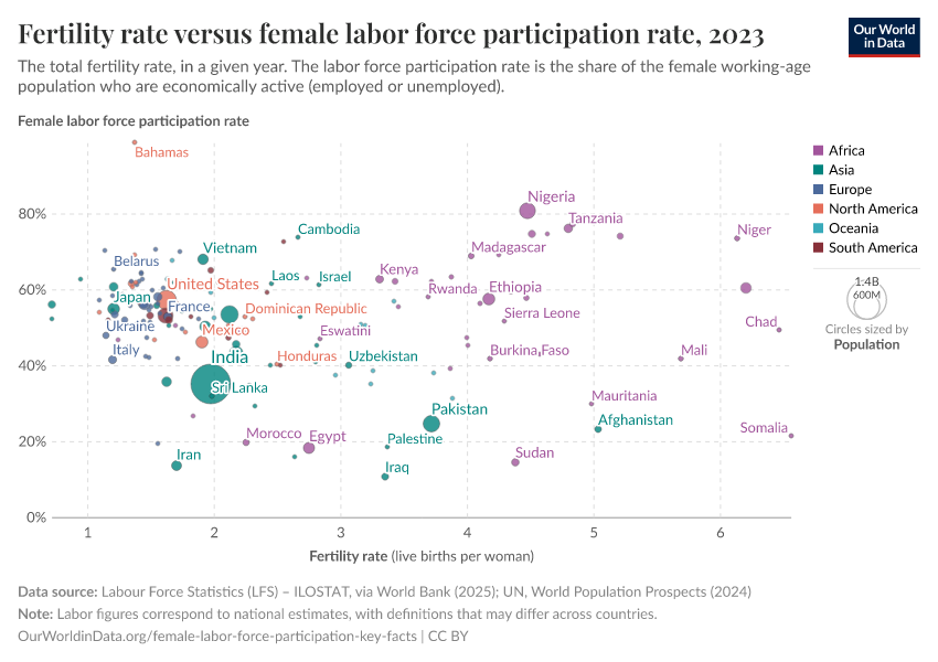 On average, mothers around the world continue to spend more time on childcare than fathers. Because of this, fewer children per woman – lower fertility rates – can theoretically free up women's time and contribute to an increase in female labor force participation.