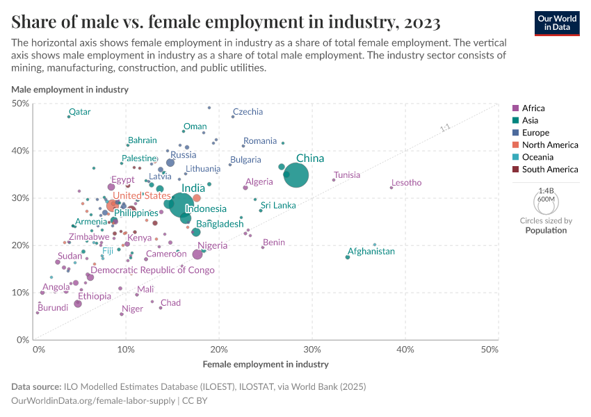 All over the world men are more likely to work in industry than women (most countries lie below the diagonal line). And women tend to work more often than men in services.