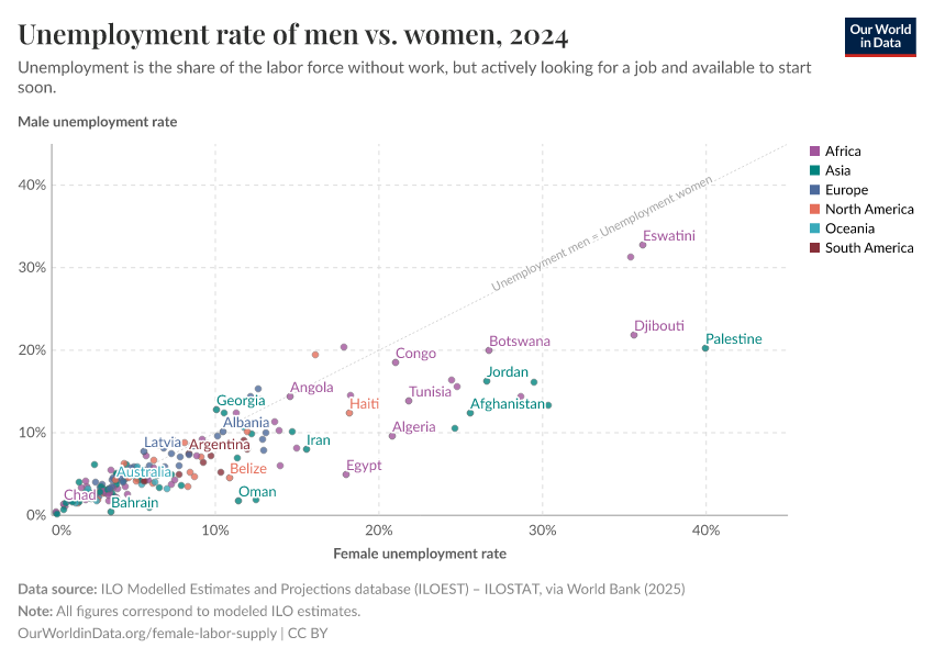 However, on the right-hand side of the chart, most countries lie significantly above the diagonal line – so in countries where unemployment is more common, women tend to be disproportionately affected.