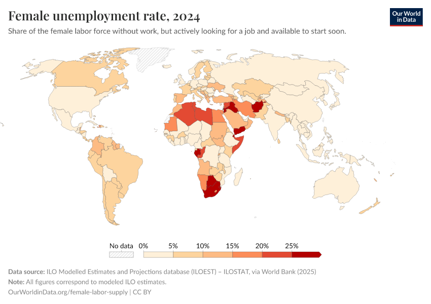 The map shows unemployment rates for women across the world. As we can see, the highest female unemployment rates correspond to the countries with the lowest female labor force participation, notably in North Africa and the Middle East.