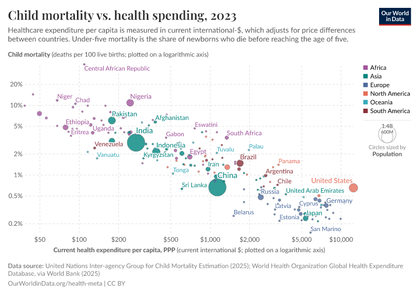 The visualization presents the relationship between child mortality – measured as the share of children dying before their fifth birthday – and healthcare expenditure per capita. The chart shows the level of both measures in the first and last year for which data is available. The arrows connect these two observations, thereby showing the change over time for all countries in the world. We can see that child mortality is declining as more money is spent on health.
