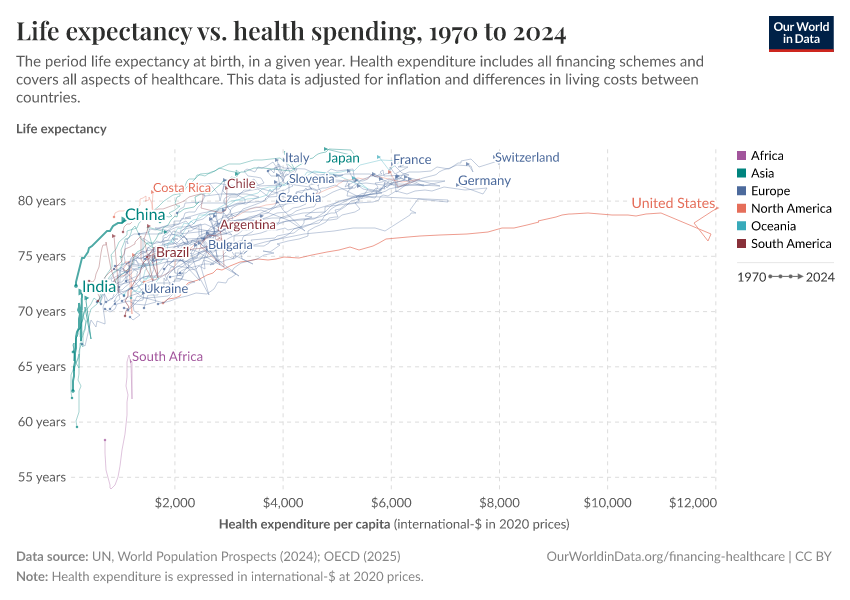 The association between health spending and increasing life expectancy also holds for rich countries in Europe, Asia, and North America in the upper right corner of the chart. The US is an outlier that achieves only a comparatively short life expectancy considering the fact that the country has by far the highest health expenditure of any country in the world. We will get back to this below.
