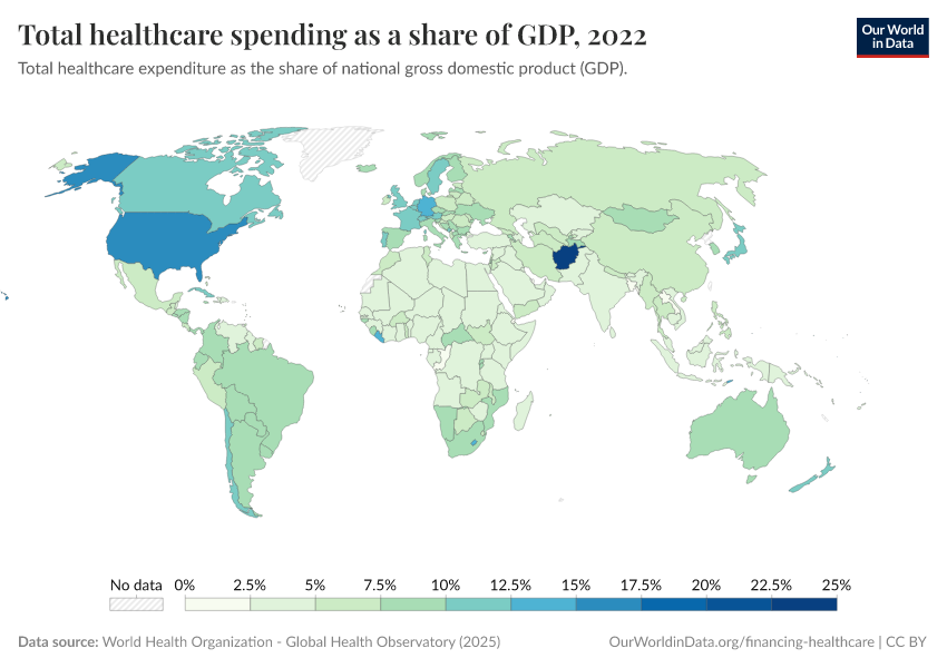 Despite significant cross-country heterogeneity in health expenditure, all countries spend less than a quarter of gross domestic product (GDP) on healthcare. As the chart shows, most countries spend between 5-12.5 percent of GDP.