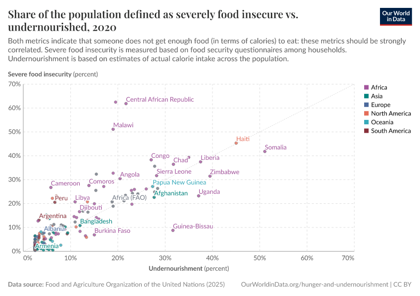 In the chart below we see the correlation between these two metrics: on the y-axis we have the prevalence of severe food insecurity, and on the x-axis we have the prevalence of undernourishment. If these estimates were identical, they’d lie along the diagonal gray line.
