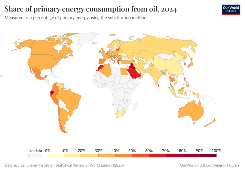 This interactive chart shows primary energy consumption from oil across the world. This represents oil production adjusted for trade (so, oil exports are subtracted and imports are added).