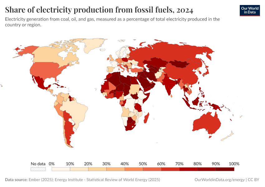 This interactive map shows the share of electricity that comes from fossil fuels (coal, oil, and gas summed together) across the world. Oil accounts for only a small share of electricity production – most come from coal and gas. The share from coal, oil and gas individually can be found in the sections below.