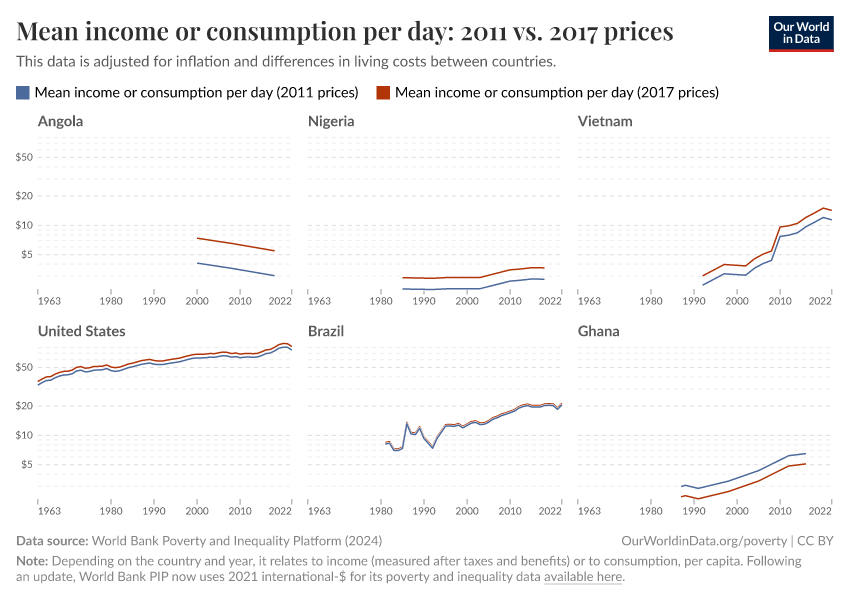 The World Bank has since updated its methods, and now measures incomes in 2021 international-$. As part of these changes, the International Poverty Line used to measure extreme poverty has also been updated: from $1.90 a day (in 2011 prices) to $2.15 a day (in 2017 prices) to $3 a day (in 2021 prices).