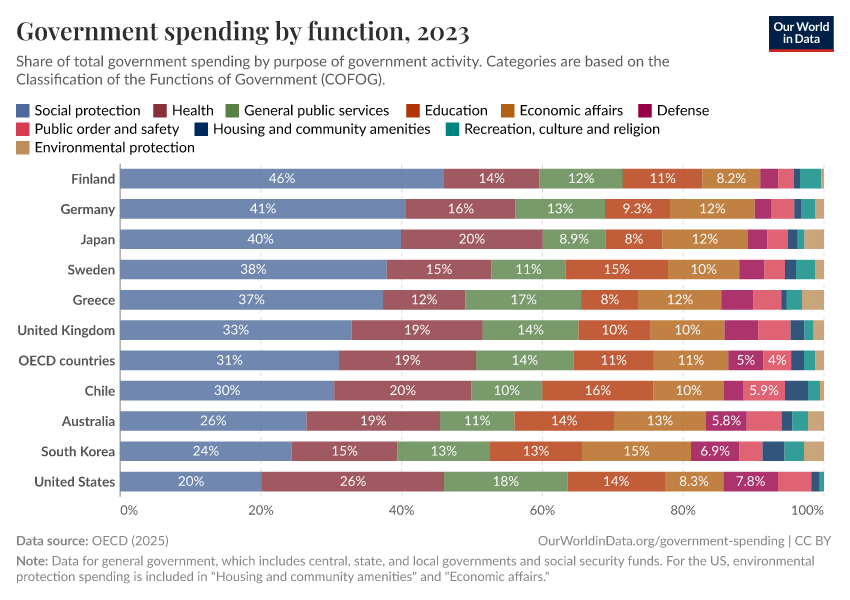 The chart shows how governments divide total spending across ten categories.1 You can also see spending in these categories as a share of GDP.