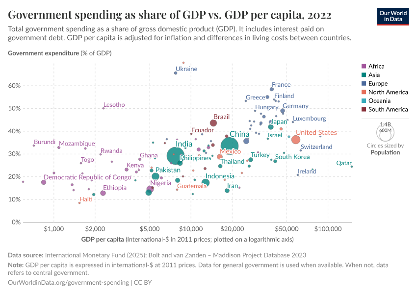 We have already pointed out that government spending as a share of GDP is higher in richer countries. The visualization provides further evidence of the extent of this correlation.
