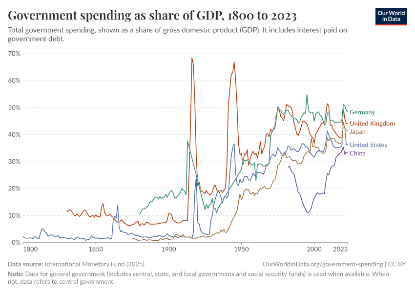 The visualization shows the evolution of government spending as a share of Gross Domestic Product (GDP), for a selection of countries over the last century.