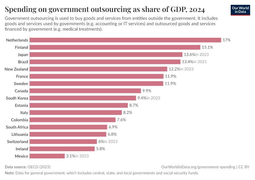 As we can see, governments in many high-income countries spend substantial resources via outsourcing.