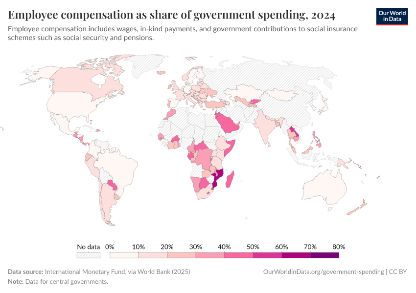 The next chart shows the share of central government spending that goes to the compensation of government employees. Compensation of employees includes all salaries and benefits (both in cash and in-kind).