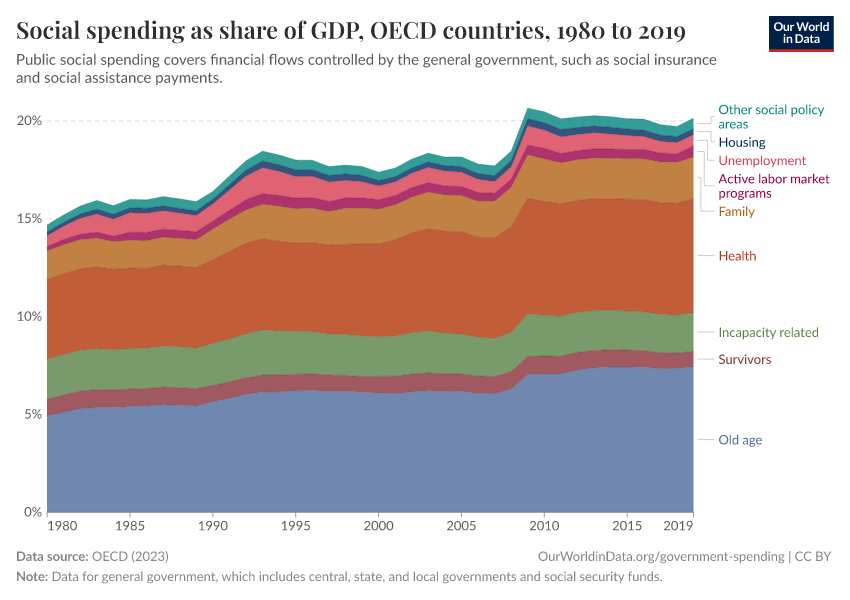 This data comes from the OECD Social Expenditure Database (SOCX). It includes what governments spend on social protection — as defined in the Classification of the Functions of Government (COFOG) — but also covers other areas that COFOG lists separately. The full list of social expenditures included is available in the OECD SOCX Manual.