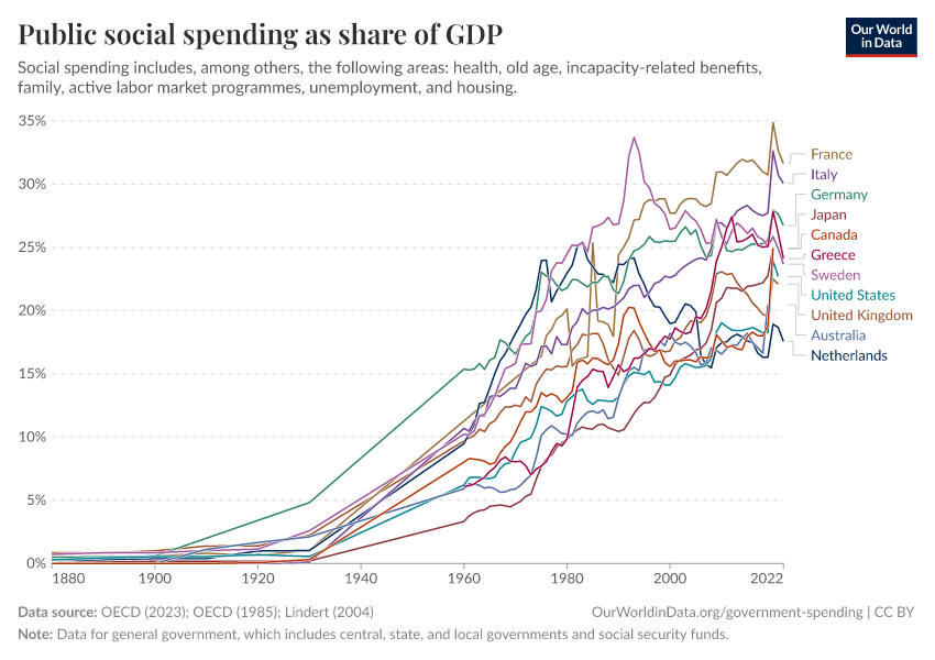 The chart above shows that government spending in early-industrialized countries grew substantially in the 20th century. The next visualization shows that this was the result of growth, specifically in social spending.