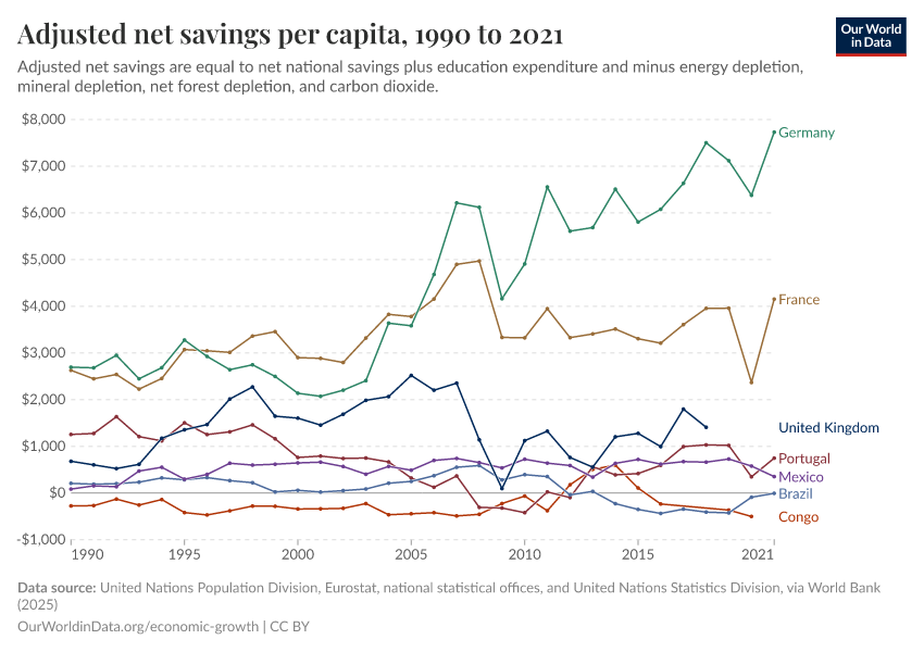 “Data Page: Adjusted net savings per capita”. Our World in Data (2025). Data adapted from United Nations Population Division, Eurostat, national statistical offices, and United Nations Statistics Division, via World Bank. Retrieved from https://auto-epoch.owid.pages.dev:8789/20250916-102301/grapher/adjusted-net-savings-per-person.html [online resource] (archived on September 16, 2025).How to cite this data