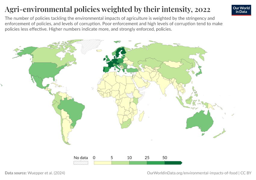 “Data Page: Agri-environmental policies weighted by their intensity”. Our World in Data (2025). Data adapted from Wuepper et al. (2024). Retrieved from https://auto-epoch.owid.pages.dev:8789/20250909-093708/grapher/agri-environmental-policies-intensity.html [online resource] (archived on September 9, 2025).How to cite this data