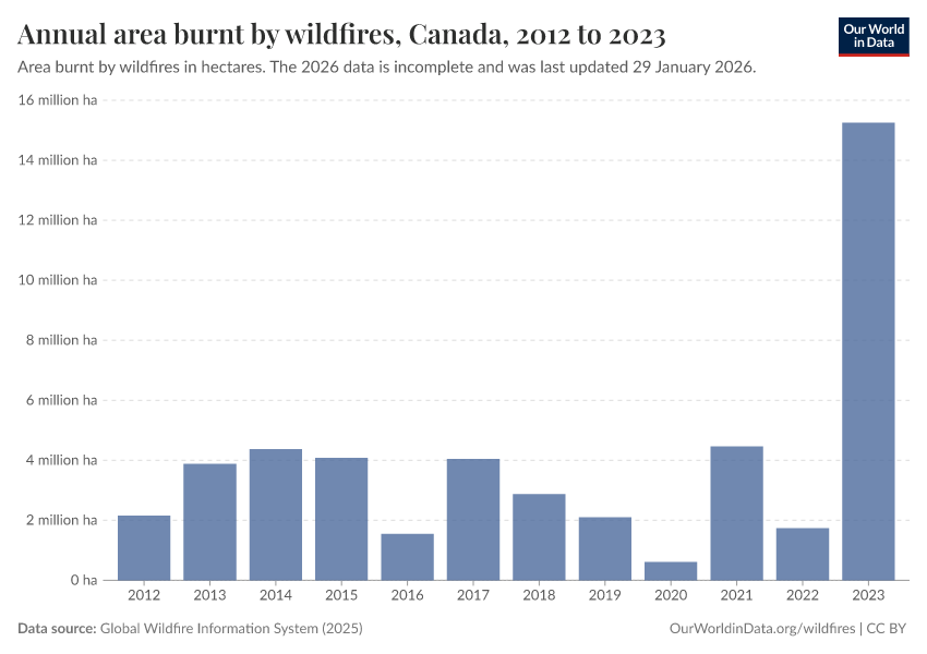 “Data Page: Annual area burnt by wildfires”, part of the following publication: Hannah Ritchie, Pablo Rosado, and Veronika Samborska (2024) - “Climate Change”. Data adapted from Global Wildfire Information System. Retrieved from https://auto-epoch.owid.pages.dev:8789/20260130-090224/grapher/annual-area-burnt-by-wildfires.html [online resource] (archived on January 30, 2026).How to cite this data