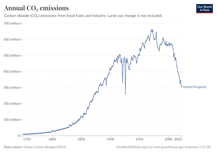 • This data is based on territorial emissions, meaning the emissions produced within a country's borders, but not those from imported goods. For example, emissions from imported steel are counted in the country where the steel is produced. To learn more and look at emissions adjusted for trade, read our article: How do CO₂ emissions compare when we adjust for trade?