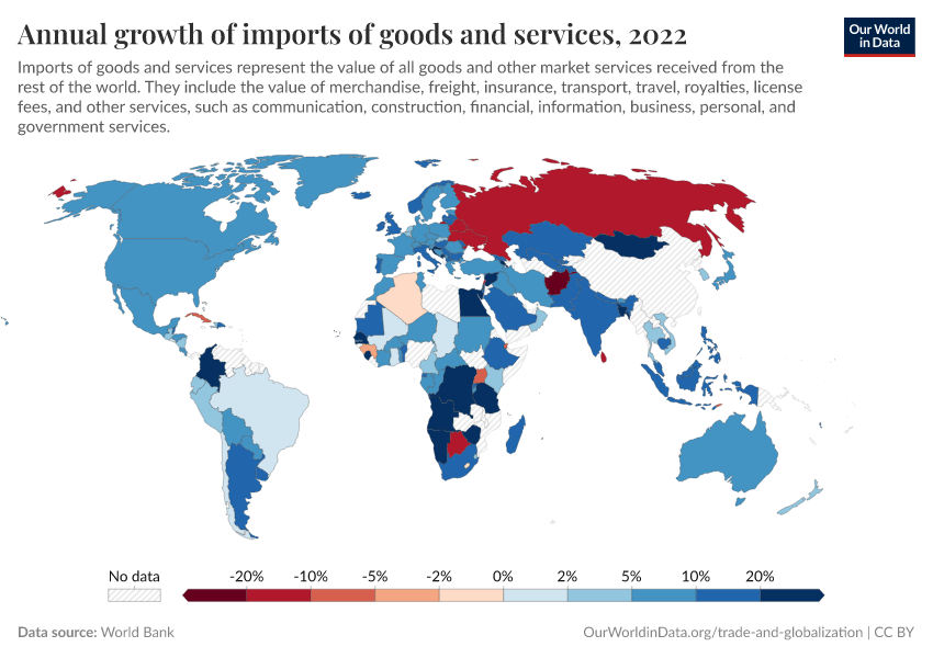World Bank – processed by Our World in Data. “Annual growth of imports of goods and services” [dataset]. World Bank, “World Bank national accounts data, and OECD National Accounts data files.” [original data]. Retrieved November 2, 2025 from https://auto-epoch.owid.pages.dev:8789/20250909-093708/grapher/annual-growth-of-imports-of-goods-and-services.html (archived on September 9, 2025).