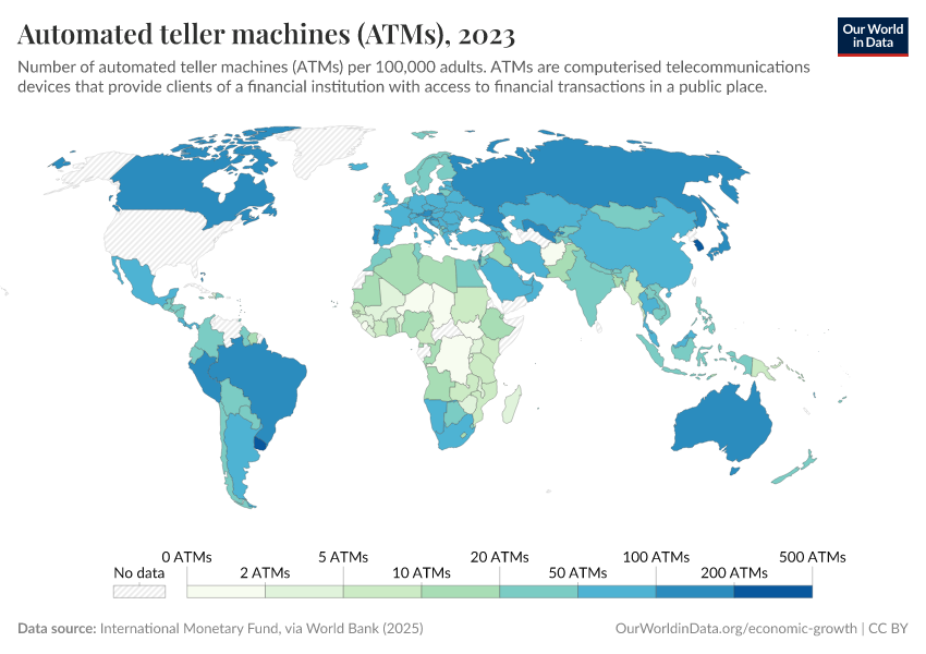 International Monetary Fund, via World Bank (2025) – processed by Our World in Data. “Automated teller machines (ATMs)” [dataset]. International Monetary Fund, via World Bank, “World Development Indicators 122” [original data]. Retrieved November 2, 2025 from https://auto-epoch.owid.pages.dev:8789/20250916-102301/grapher/automated-teller-machines-atms-per-100000-adults.html (archived on September 16, 2025).