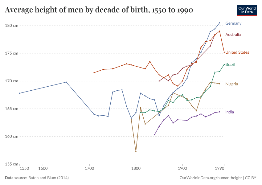 Baten and Blum (2014) – with minor processing by Our World in Data. “Average height of men by decade of birth” [dataset]. Baten and Blum, “Height” [original data]. Retrieved February 1, 2026 from https://auto-epoch.owid.pages.dev:8789/20250909-093708/grapher/average-height-of-men-for-selected-countries.html (archived on September 9, 2025).