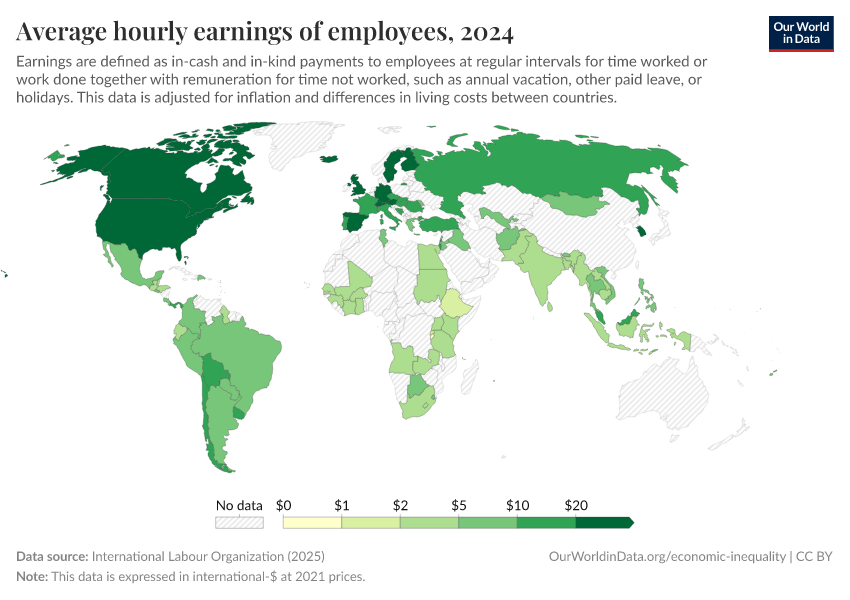 “Data Page: Average hourly earnings of employees”. Our World in Data (2025). Data adapted from International Labour Organization. Retrieved from https://auto-epoch.owid.pages.dev:8789/20250923-151844/grapher/average-hourly-earnings.html [online resource] (archived on September 23, 2025).How to cite this data