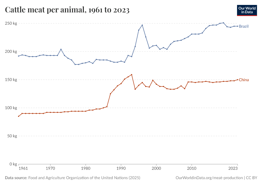 Food and Agriculture Organization of the United Nations (2025) – with major processing by Our World in Data. “Cattle meat yield per animal – UN FAO” [dataset]. Food and Agriculture Organization of the United Nations, “Production: Crops and livestock products” [original data]. Retrieved November 2, 2025 from https://auto-epoch.owid.pages.dev:8789/20250909-093708/grapher/cattle-meat-yields-hectograms-100-grams-per-animal.html (archived on September 9, 2025).