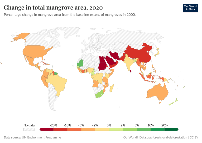 “Data Page: Change in total mangrove area”. Our World in Data (2025). Data adapted from UN Environment Programme. Retrieved from https://auto-epoch.owid.pages.dev:8789/20250909-093708/grapher/change-in-total-mangrove-area.html [online resource] (archived on September 9, 2025).How to cite this data