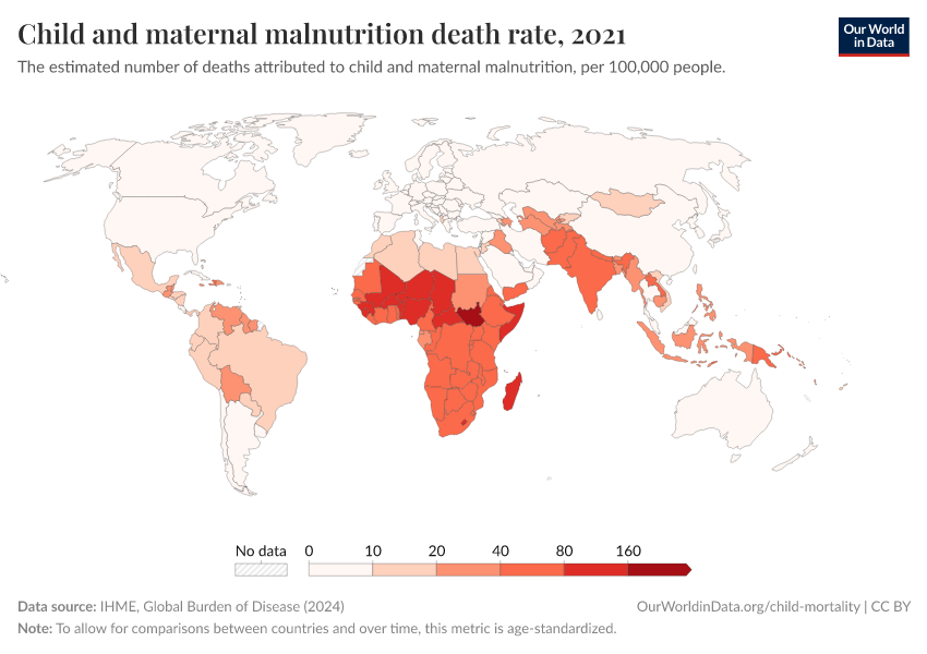 IHME, Global Burden of Disease (2024) – with minor processing by Our World in Data. “Child and maternal malnutrition death rate” [dataset]. IHME, Global Burden of Disease, “Global Burden of Disease - Risk Factors” [original data]. Retrieved November 2, 2025 from https://auto-epoch.owid.pages.dev:8789/20250909-093708/grapher/child-and-maternal-malnutrition-death-rate.html (archived on September 9, 2025).