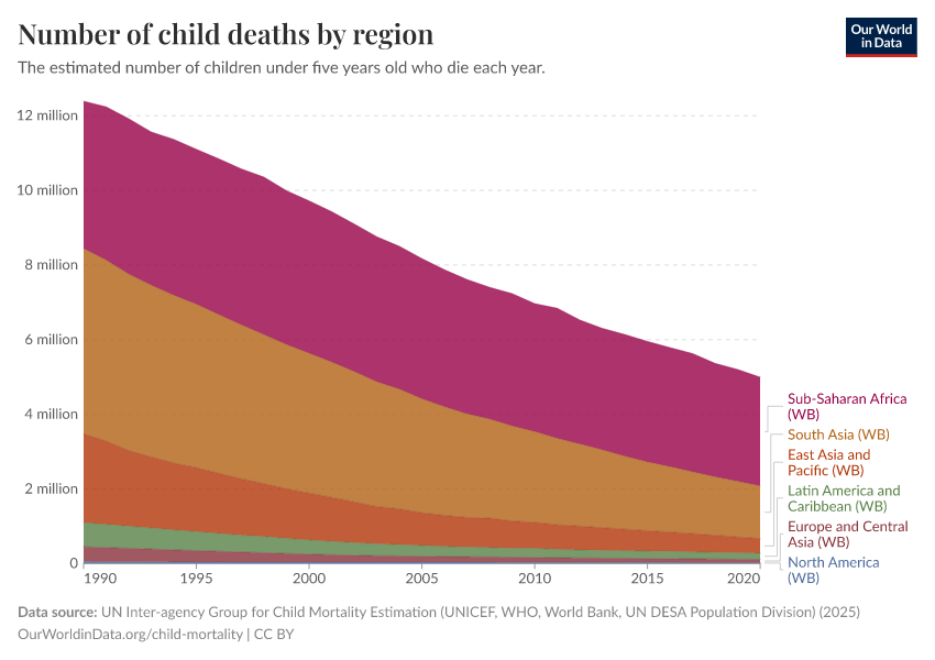 UN Inter-agency Group for Child Mortality Estimation (UNICEF, WHO, World Bank, UN DESA Population Division) (2025) – processed by Our World in Data. “Number of child deaths by region” [dataset]. UN Inter-agency Group for Child Mortality Estimation (UNICEF, WHO, World Bank, UN DESA Population Division), “World Development Indicators 122” [original data]. Retrieved November 2, 2025 from https://auto-epoch.owid.pages.dev:8789/20250916-100934/grapher/child-deaths-igme-data.html (archived on September 16, 2025).