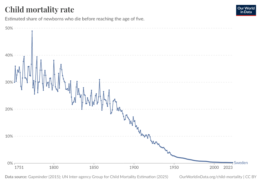 Gapminder (2015); UN Inter-agency Group for Child Mortality Estimation (2025) – processed by Our World in Data. “Child mortality rate – Gapminder; UN IGME – Long-run data” [dataset]. United Nations Inter-agency Group for Child Mortality Estimation, “United Nations Inter-agency Group for Child Mortality Estimation”; Gapminder, “Child mortality rate under age five v7”; Gapminder based on UN IGME & UN WPP, “Under-five Mortality v11”; Various sources, “Population” [original data]. Retrieved November 2, 2025 from https://auto-epoch.owid.pages.dev:8789/20250925-233948/grapher/child-mortality.html (archived on September 25, 2025).