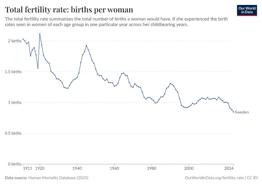 “Data Page: Fertility rate: births per woman”, part of the following publication: Saloni Dattani, Lucas Rodés-Guirao, and Max Roser (2025) - “Fertility Rate”. Data adapted from Human Fertility Database, United Nations. Retrieved from https://auto-epoch.owid.pages.dev:8789/20250909-093708/grapher/children-born-per-woman.html [online resource] (archived on September 9, 2025).How to cite this data