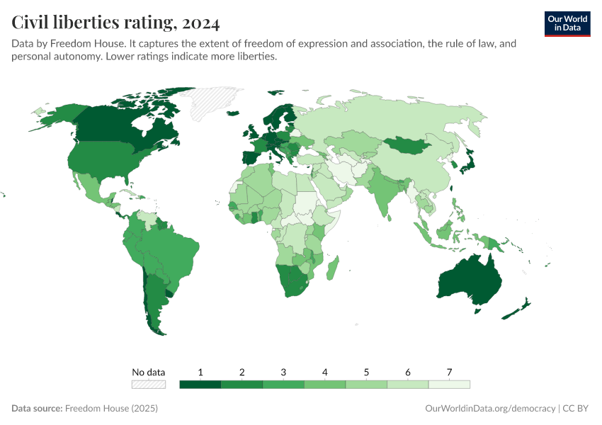 Freedom House (2025) – processed by Our World in Data. “Civil liberties rating” [dataset]. Freedom House, “Freedom in the World” [original data]. Retrieved November 2, 2025 from https://auto-epoch.owid.pages.dev:8789/20250909-093708/grapher/civil-liberties-rating-fh.html (archived on September 9, 2025).