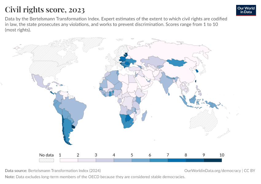 Bertelsmann Transformation Index (2024) – processed by Our World in Data. “Civil rights score” [dataset]. Bertelsmann Transformation Index, “Bertelsmann Transformation Index, Scores” [original data]. Retrieved November 2, 2025 from https://auto-epoch.owid.pages.dev:8789/20250909-093708/grapher/civil-rights-score-bti.html (archived on September 9, 2025).