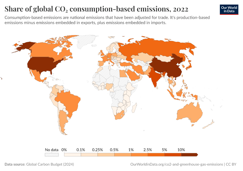 “Data Page: Share of global CO₂ consumption-based emissions”, part of the following publication: Hannah Ritchie, Pablo Rosado, and Max Roser (2023) - “CO₂ and Greenhouse Gas Emissions”. Data adapted from Global Carbon Project. Retrieved from https://auto-epoch.owid.pages.dev:8789/20250909-093708/grapher/co2-consumption-share.html [online resource] (archived on September 9, 2025).How to cite this data