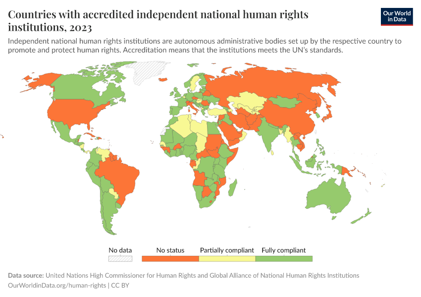 “Data Page: Countries with accredited independent national human rights institutions”. Our World in Data (2025). Data adapted from United Nations High Commissioner for Human Rights and Global Alliance of National Human Rights Institutions. Retrieved from https://auto-epoch.owid.pages.dev:8789/20250909-093708/grapher/countries-with-independent-national-human-rights-institution.html [online resource] (archived on September 9, 2025).How to cite this data