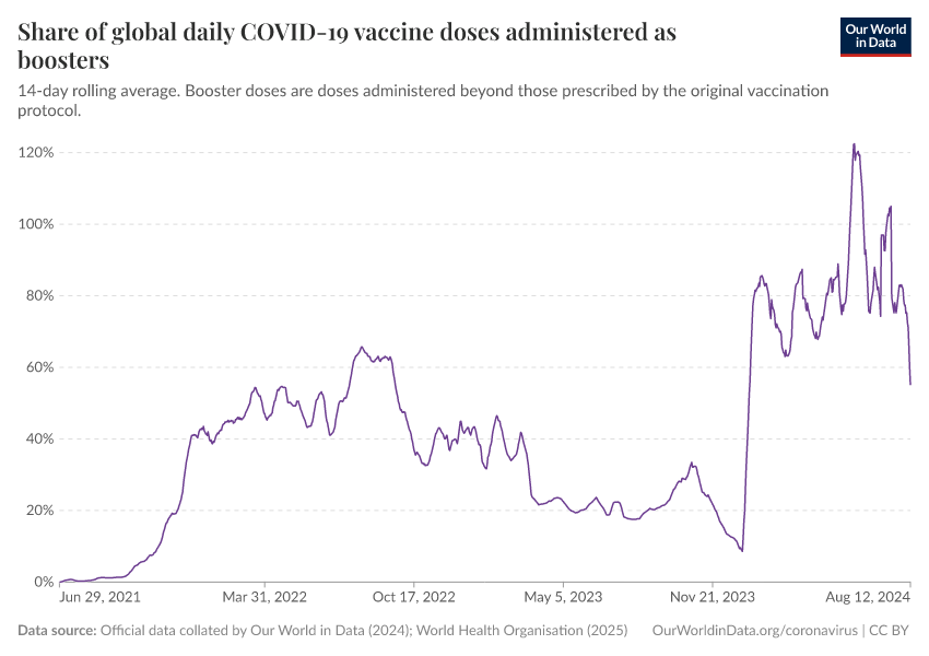 Official data collated by Our World in Data (2024); World Health Organisation (2025) – with major processing by Our World in Data. “Share of global daily COVID-19 vaccine doses administered as boosters” [dataset]. Official data collated by Our World in Data, “COVID-19, vaccinations”; World Health Organisation, “COVID-19, vaccinations (WHO)” [original data]. Retrieved November 2, 2025 from https://auto-epoch.owid.pages.dev:8789/20250909-093708/grapher/covid-vaccine-share-boosters.html (archived on September 9, 2025).