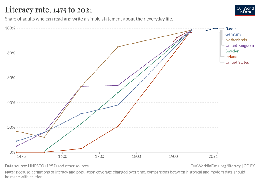 - 1451–1800: Direct literacy surveys did not exist during this period. Data for Great Britain, Ireland, France, Belgium, the Netherlands, Germany, Italy, Spain, Sweden, and Poland comes from the "Charting the Rise of the West" study. The authors estimated literacy rates using manuscript and book production as indirect indicators. While more books likely indicated more readers, this approach has clear limitations.