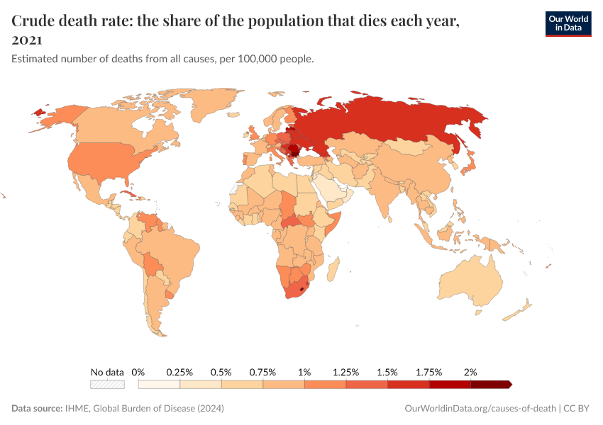 IHME, Global Burden of Disease (2024) – with minor processing by Our World in Data. “Crude death rate: the share of the population that dies each year” [dataset]. IHME, Global Burden of Disease, “Global Burden of Disease - Deaths and DALYs” [original data]. Retrieved November 2, 2025 from https://auto-epoch.owid.pages.dev:8789/20250909-093708/grapher/crude-death-rate-the-share-of-the-population-that-dies-each-year-gbd.html (archived on September 9, 2025).