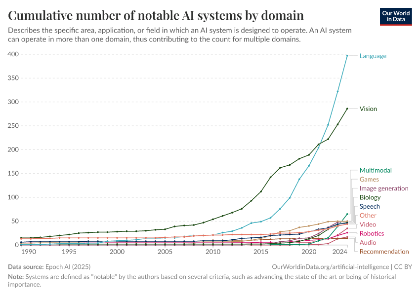 Epoch AI (2025) – with major processing by Our World in Data. “Cumulative number of notable AI systems by domain” [dataset]. Epoch AI, “Parameter, Compute and Data Trends in Machine Learning” [original data]. Retrieved November 2, 2025 from https://auto-epoch.owid.pages.dev:8789/20251009-110947/grapher/cumulative-number-of-notable-ai-systems-by-domain.html (archived on October 9, 2025).