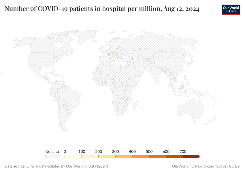 “Data Page: Number of COVID-19 patients in hospital per million”, part of the following publication: Edouard Mathieu, Hannah Ritchie, Lucas Rodés-Guirao, Cameron Appel, Daniel Gavrilov, Charlie Giattino, Joe Hasell, Bobbie Macdonald, Saloni Dattani, Diana Beltekian, Esteban Ortiz-Ospina, and Max Roser (2020) - “COVID-19 Pandemic”. Data adapted from Official data collated by Our World in Data. Retrieved from https://auto-epoch.owid.pages.dev:8789/20250909-093708/grapher/current-covid-hospitalizations-per-million.html [online resource] (archived on September 9, 2025).
