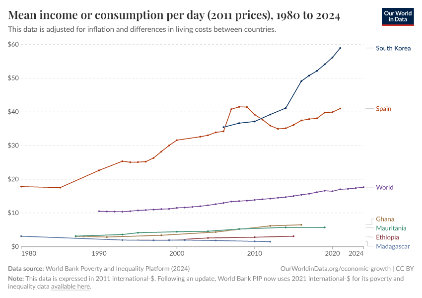 “Data Page: Mean income or consumption per day (2011 prices)”, part of the following publication: Joe Hasell, Bertha Rohenkohl, Pablo Arriagada, Esteban Ortiz-Ospina, and Max Roser (2022) - “Poverty”. Data adapted from World Bank Poverty and Inequality Platform. Retrieved from https://auto-epoch.owid.pages.dev:8789/20250909-093708/grapher/daily-mean-income-2011-ppp.html [online resource] (archived on September 9, 2025).How to cite this data