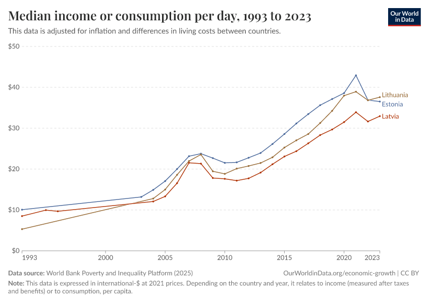 “Data Page: Median income or consumption per day”, part of the following publication: Joe Hasell, Bertha Rohenkohl, Pablo Arriagada, Esteban Ortiz-Ospina, and Max Roser (2022) - “Poverty”. Data adapted from World Bank Poverty and Inequality Platform. Retrieved from https://auto-epoch.owid.pages.dev:8789/20260127-114142/grapher/daily-median-income.html [online resource] (archived on January 27, 2026).How to cite this data