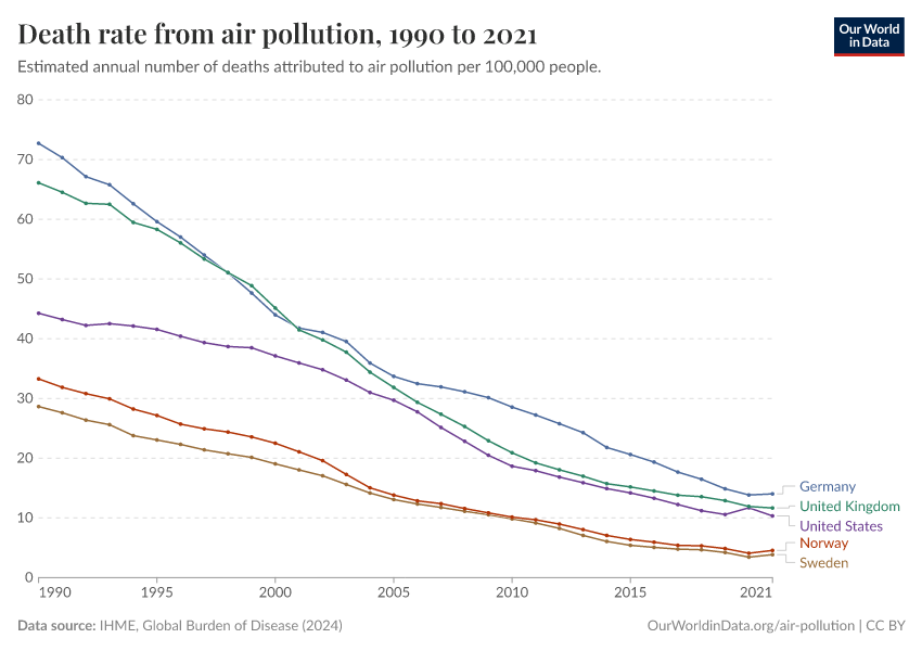 IHME, Global Burden of Disease (2024) – with minor processing by Our World in Data. “Death rate from air pollution” [dataset]. IHME, Global Burden of Disease, “Global Burden of Disease - Risk Factors” [original data]. Retrieved November 2, 2025 from https://auto-epoch.owid.pages.dev:8789/20250909-093708/grapher/death-rate-from-air-pollution-per-100000.html (archived on September 9, 2025).