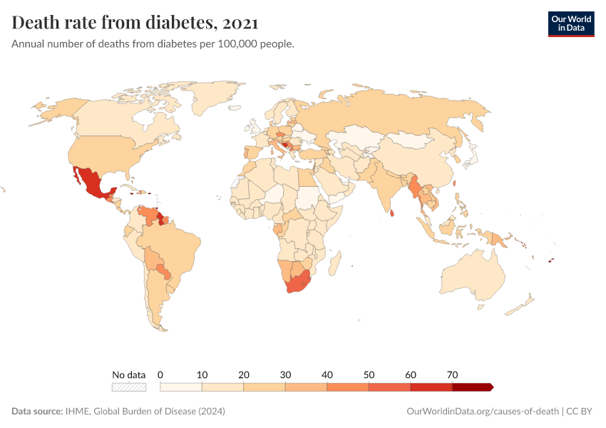 IHME, Global Burden of Disease (2024) – with minor processing by Our World in Data. “Death rate from diabetes” [dataset]. IHME, Global Burden of Disease, “Global Burden of Disease - Deaths and DALYs” [original data]. Retrieved November 2, 2025 from https://auto-epoch.owid.pages.dev:8789/20250909-093708/grapher/death-rate-from-diabetes-gbd.html (archived on September 9, 2025).