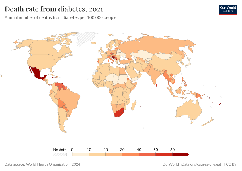 World Health Organization (2024) – with major processing by Our World in Data. “Death rate from diabetes” [dataset]. World Health Organization, “Global Health Estimates” [original data]. Retrieved November 2, 2025 from https://auto-epoch.owid.pages.dev:8789/20250909-093708/grapher/death-rate-from-diabetes-ghe.html (archived on September 9, 2025).
